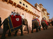 - 風の宮殿のある紅砂岩のジャイプール、郊外の丘に建つアンベール城へは象のタクシーに乗って登城します。