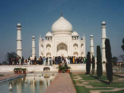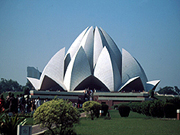 | 世界各国から多くの人々が訪れるタージマハル。壮麗な白い大理石の姿は四季を問わず輝いています。 | アグラ城の外壁は赤砂岩で造られています。細かい模様が彫刻されており優雅な影が映し出されています。 | 蓮寺と呼ばれている1986年に建てられたバハーイー教の寺院。 |