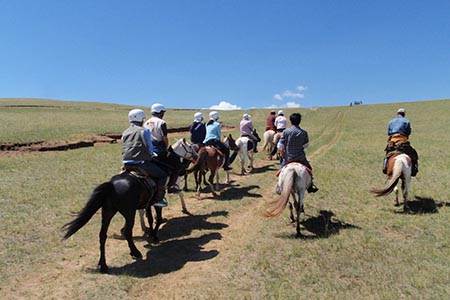 朝食後、馬とともに遊牧民(指導員)からの乗馬レッスン(説明)を受けます。 その後、いよいよ大草原・2泊3日の遠出へ。 2代目皇帝オゴダイハーンの築いた古都カラコルムを目指し乗馬ライディング・ロードへ出発。 丘や林、小川など大草原風景が待っています。 途中、遊牧民のゲルを訪問します。遊牧民特製手作りチーズや乳茶、時期により馬乳酒など遊牧民との交流をお楽しみください。 到着後、テントをみんなで設営。食事は同行スタッフが心をこめてつくります。 みんなで協力しましょう。 ブルド郊外越え、4日目にカラコルム近郊付近に入りましょう。 ※雑木林を抜け、小川などを渡ることも。ライディング中に馬から降りて引く箇所もあります。 |
