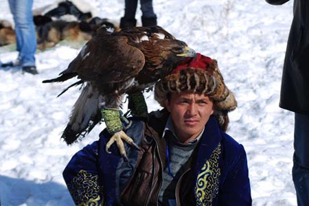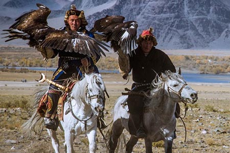朝食後、車にてカザフ族の遊牧民のゲルへ。伝統的な馬に乗りイヌワシを使って狩りをおこなう鷲匠の生活体験。 狩りをするためのレッスンを受けます。 鷲を腕に乗せる訓練や狩りに必要な乗馬の説明を受けます。 ある程度騎乗で腕に鷲を乗せることができるようになったら、鷲匠と一緒に狩りの体験へ出かけます。 ※現地の気象条件や現地諸事情により鷲狩りができない場合はカザフ族の普段の生活を体験して頂きます。 宿泊先はゲル、テントまたはホテルとなります。 |