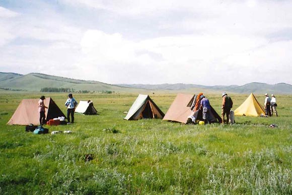 大草原に立つ巨大なシルバーチンギスハン騎馬像へ向けて、大草原のテントの設営の場所へ向けて遊牧民と馬とともに乗馬ライディング・ライフへ出発。丘や林、小川お花畑、羊たちの群れなど大草原風景が待っています。 途中、遊牧民のゲルを訪問します。 遊牧民特製手作りチーズや乳茶、時期により馬乳酒など遊牧民との交流をお楽しみください。 上達にあわせ遊牧民が無理のない乗馬ライディングを行いますが、乗馬移動距離は1日10~30kmを目標にしています。 到着後、テントをみんなで設営。 食事は同行スタッフが青空レストランで心をこめてつくります。 みんなで協力しましょう。 満天の星空の下での大草原のテント泊をお楽しみください。 天気の良い日はたき火をしたり、ゲームをしたりすることも! (鳴きウサギやハリネズミなどの小動物にであえるかも、夜はオオカミの遠吠えが聞こえることも!) |