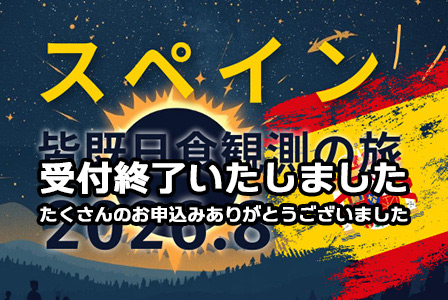 2026年8月 『スペイン皆既日食観測の旅』受付終了いたしました たくさんのお申込みありがとうございました。 https://eclipse.tabitamago.jp/total-solar-eclipse-spain-2026/ -