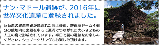 観光内容 : ポンペイ本島のまわりのエメラルドグリーンの海が遊び場です。シュノーケリングとカヤックをお楽しみ頂けます!