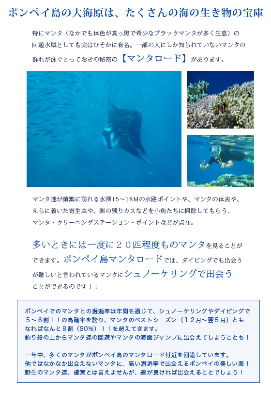 朝食後、スタッフがお迎えにあがります。無人島とアンツ環礁の大自然のなかで、お過ごしください。 シュノーケリングもお楽しみ頂けます。 ※シュノーケリングの道具は無料でお貸出しております。 午後、ポンペイ島へもどります。その後、ホテルへ。 【食事】朝:ホテル / 昼:ランチボックス / 夕:なし
