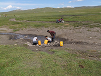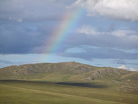 | 昼ごはん場所のそばにあった小川。牛さんや馬さんなども水を飲んでい るようです | 小川の湧き出し口では遊牧民の人たちも水を汲みに来ていました | 虹です。最近のモンゴルは昔より雨が多くなってきているようです |