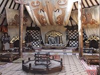 | パンク修理中。道なき道を走るので、パンク修理もお手の物って感じです | 13世紀村のハーンの座。 ハーンのコスプレの人とかがいたらよかったんですが。 |